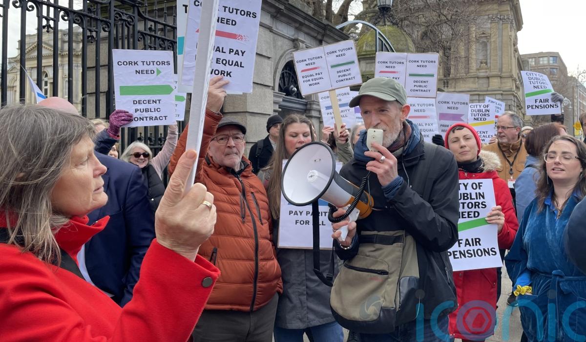 Dozens of tutors gathered at the gates of Leinster House on Wednesday to call for public sector contracts and protest against “abusive” working conditions.