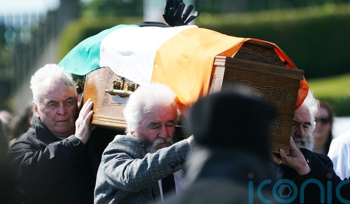 Several hundred people walked in the funeral procession while others watched as the coffin, bearing an Irish tricolour flag, a beret and a pair of black gloves, was carried.