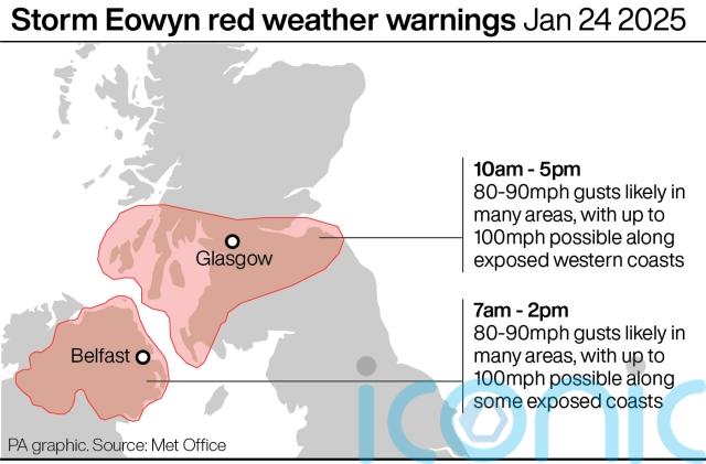 It comes as forecasters warned Storm Eowyn could bring winds of up to 100mph in areas affected by the rare weather alert across Scotland, Northern Ireland and north Wales on Friday.
