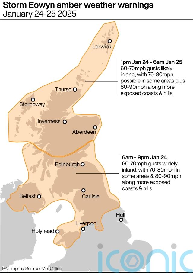 Other areas covered by an amber weather warning for wind include the southern half of Scotland between 6pm and 9pm on Friday, and for the northern half of Scotland from 1pm on Friday to 6am on Saturday.