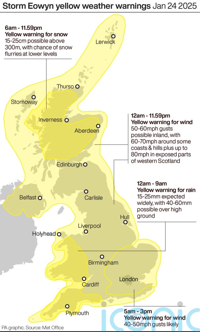 “In addition to this, red, amber and yellow weather warnings have been issued due to Storm Eowyn and is expected to bring very strong winds, rain and snow to most parts of Great Britain on Friday 24 January, and across parts of northern England and Scotland on Saturday 25 January.