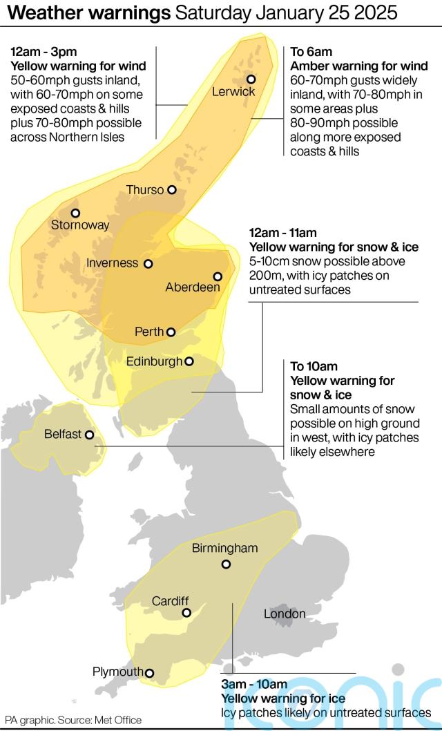 In Northern Ireland, a yellow warning for snow and ice has been issued between 7pm on Friday until 10am on Saturday.