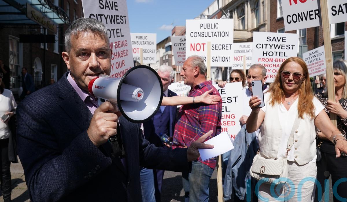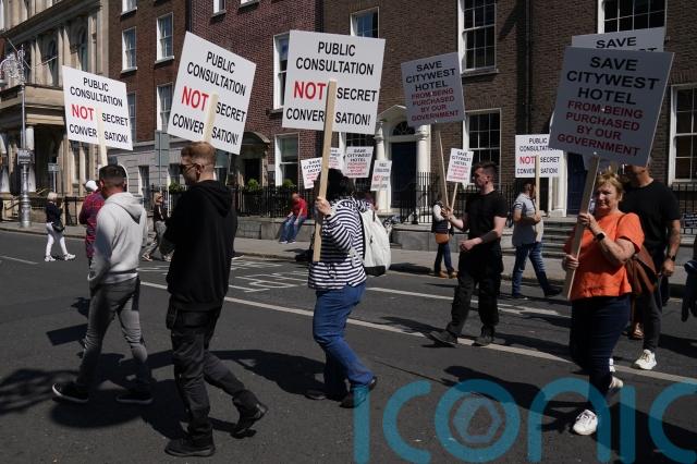 Around two dozen protesters gathered outside Leinster House on Wednesday holding signs that read “Public consultation, not secret conversation” and “Save Citywest Hotel from being purchased by our Government”.