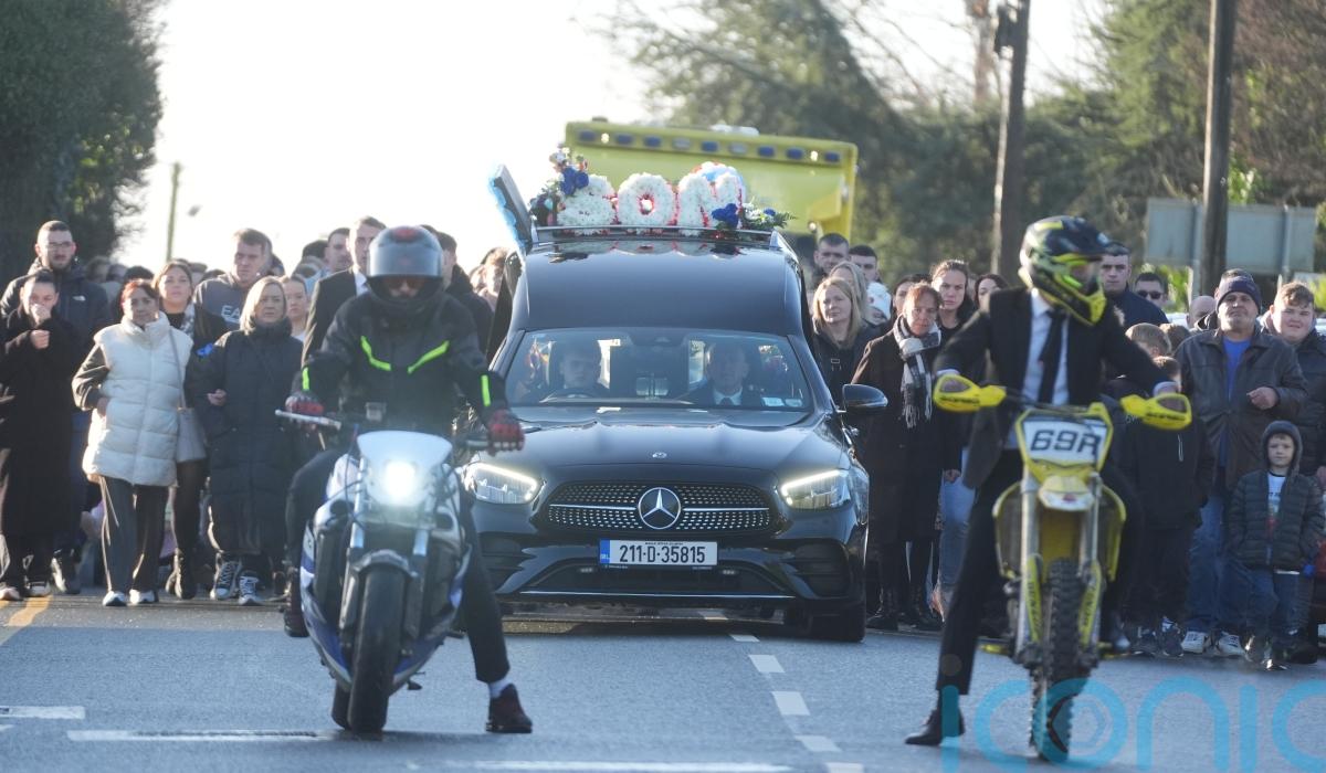 Later inside the church, Tadgh’s small white coffin was topped with flowers and accompanied by two pictures of the child, including one of him on a dirt bike.