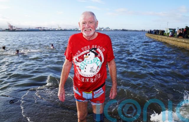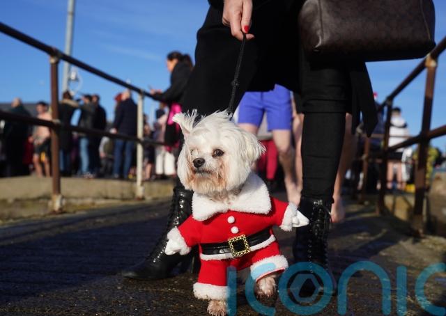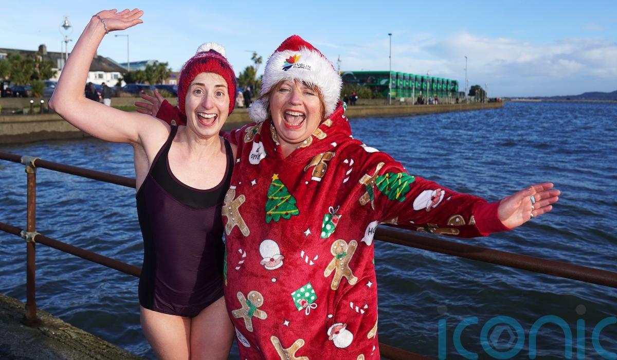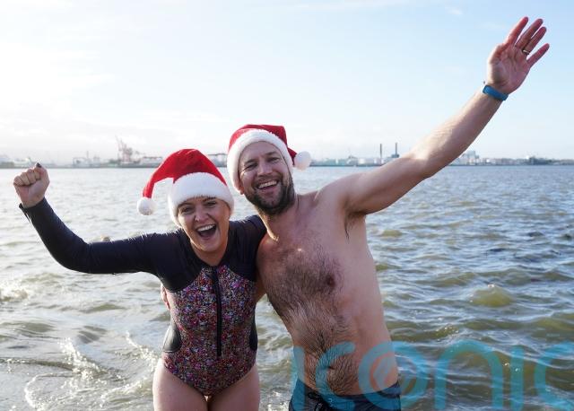 Hundreds of plucky swimmers braved wintry temperatures to take a Christmas Day plunge in the sea in Dublin.