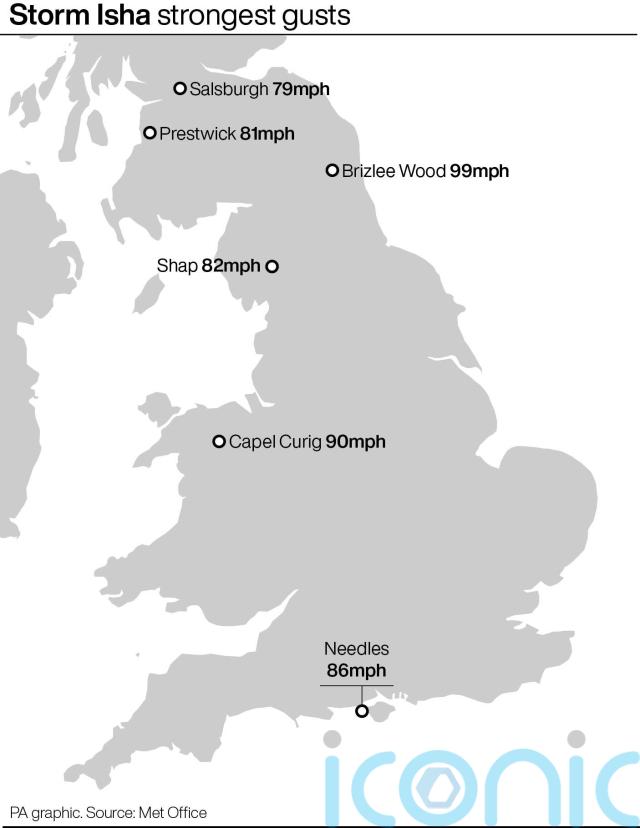 The Met Office said the highest recorded wind speed during Storm Isha was 99mph at Brizlee Wood in Northumberland, with gusts of 90mph at Capel Curig in Snowdonia on Sunday.