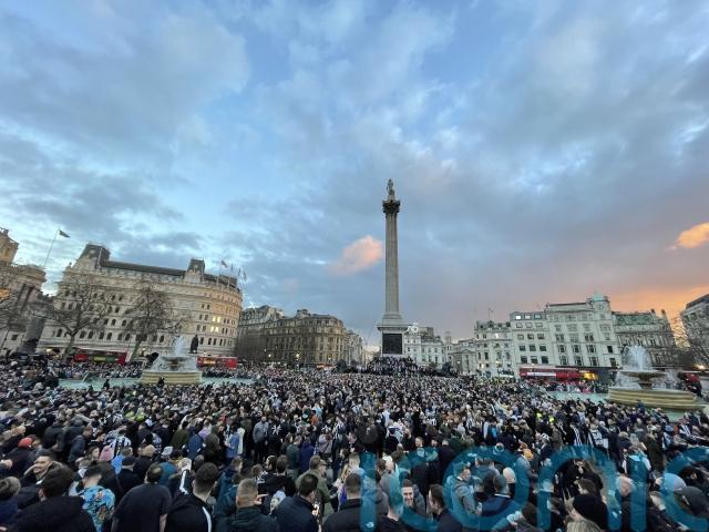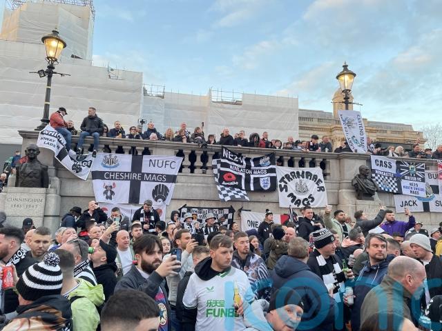Newcastle United supporters have gathered in central London’s Trafalgar Square ahead of the Carabao Cup final against Manchester United on Sunday afternoon.