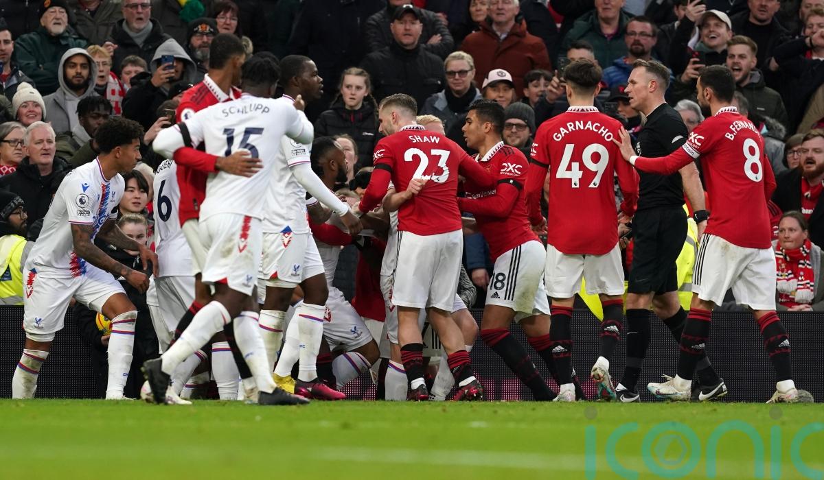United midfielder Casemiro was sent off after a VAR review of a mass melee, sparked in the second half when Palace midfielder Jeffrey Schlupp barged United winger Antony into touch.