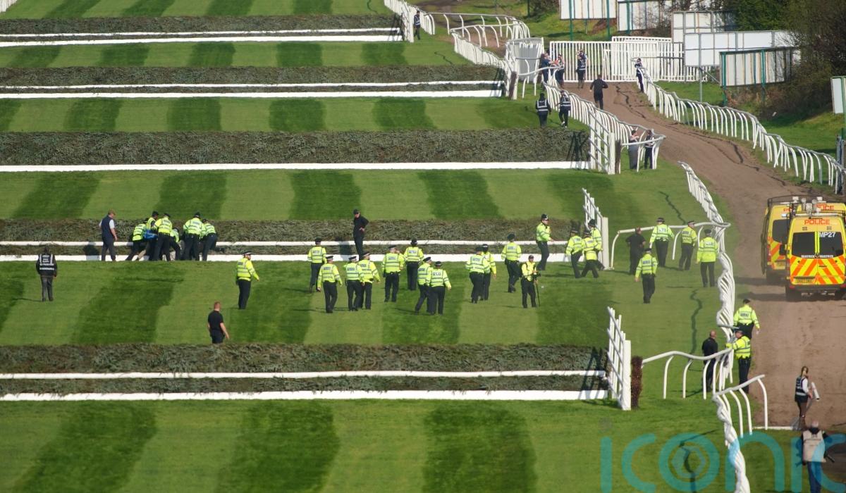 As the National runners were in the parade ring, a number of protestors breached security fences around the Liverpool venue and ran on to the course.