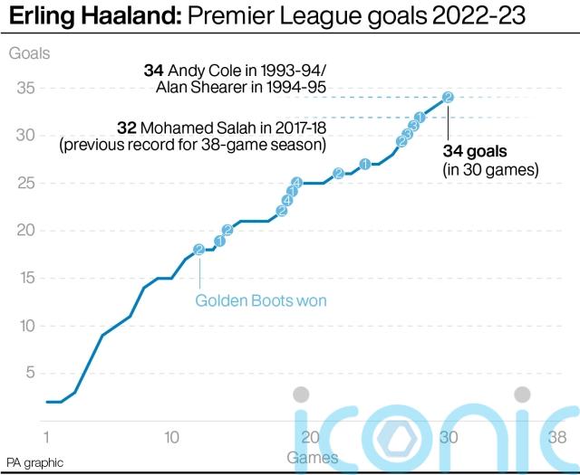 His feat is even more impressive as the record of 34 was set in the league’s early 42-game seasons by Andy Cole and Alan Shearer – here, the PA news agency looks at how Haaland compares.