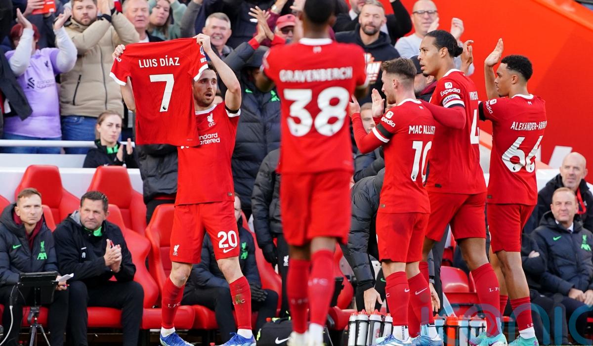 Jota held aloft Diaz’s number seven shirt after scoring, with the Colombian not featuring in Liverpool’s squad following reports his parents had been kidnapped in his homeland.