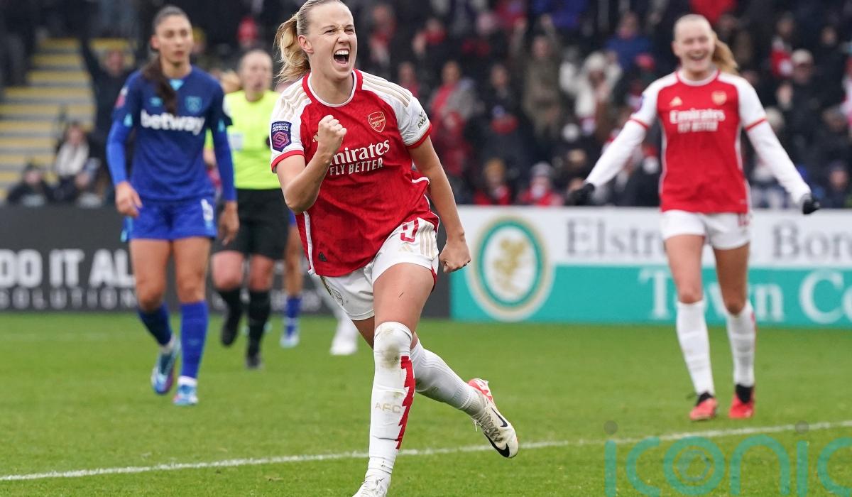 Beth Mead scored twice as Arsenal thumped struggling West Ham 3-0 at Meadow Park in the Women’s Super League.