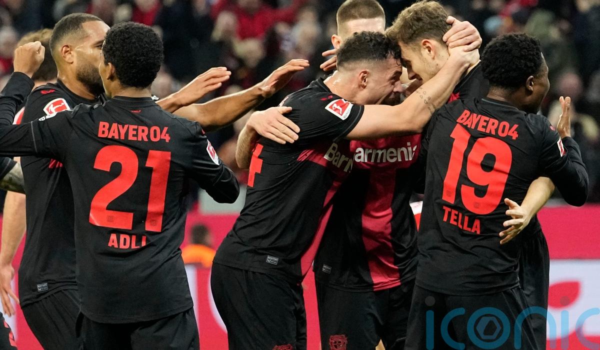 Jeremie Frimpong fired into an empty net in stoppage time to cap Bayer Leverkusen’s outstanding 3-0 win over Bayern Munich as they celebrated carnival weekend in the Rhineland by moving five points clear at the top of the Bundesliga.