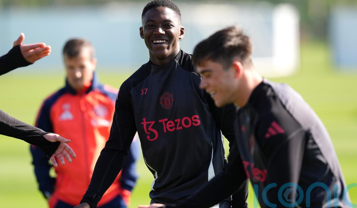 Kobbie Mainoo trains with his Manchester United team-mates ahead of Lyon trip