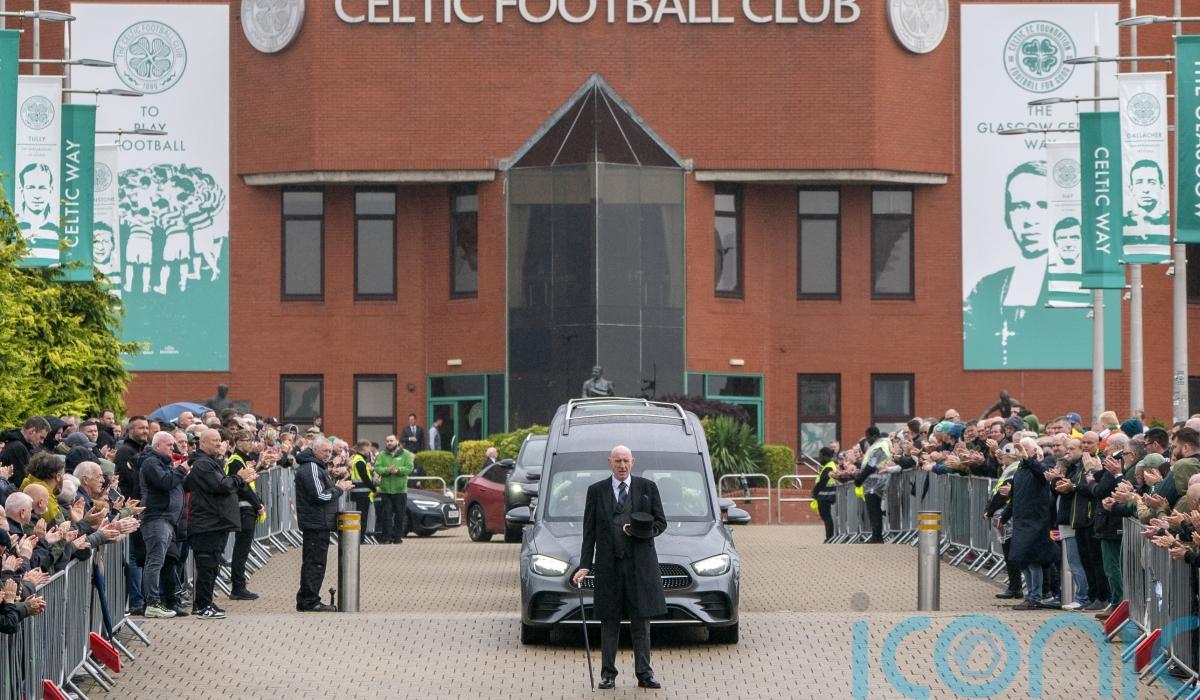 After the service, hundreds of fans braved wet and windy weather outside Celtic’s Parkhead stadium to pay their own tributes as the cortege passed.