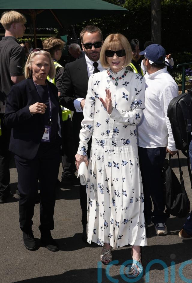 Dame Anna, who recently announced she was stepping down as day-to-day editor of American Vogue, arrived at the championships in her signature dark sunglasses and wearing a white dress adorned with blue flowers.