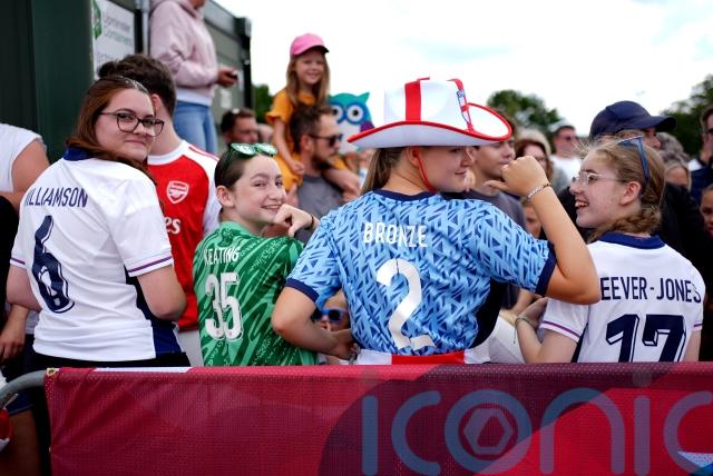 Among the fans were twins Poppy and Daisy Macdonald, 11, from Benfleet, Essex, who were holding a sign asking for a photo with star striker Alessia Russo.