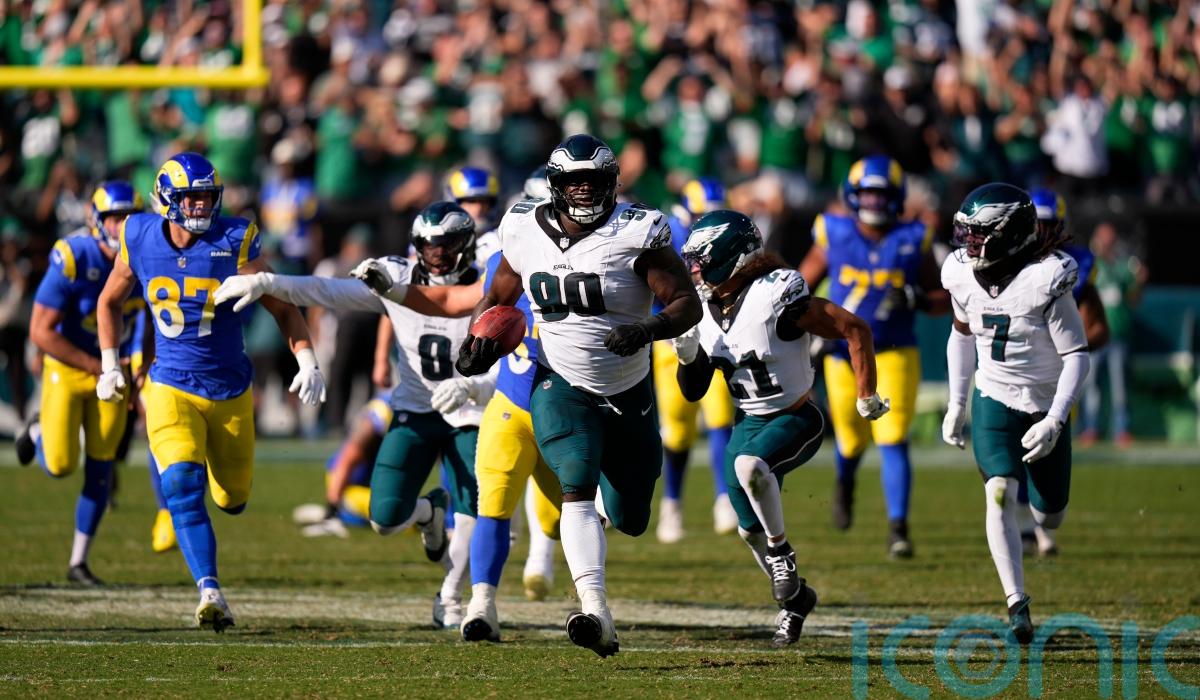 The Eagles looked set to suffer a first loss of the season but Joshua Karty’s potential game-winning field goal attempt for the Rams was blocked by Jordan Davis, who returned it for a touchdown.