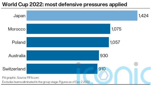 The Japanese pressing style appears to suit playing opposition that keep the ball. They are miles clear of anyone else in the tournament on FIFA’s defensive pressures applied metric (1,424), while their 2-1 victories over Germany and Spain came despite having 22 and 14 per cent of possession respectively. When that figure rose to 48 per cent against Costa Rica, they suffered a 1-0 defeat.